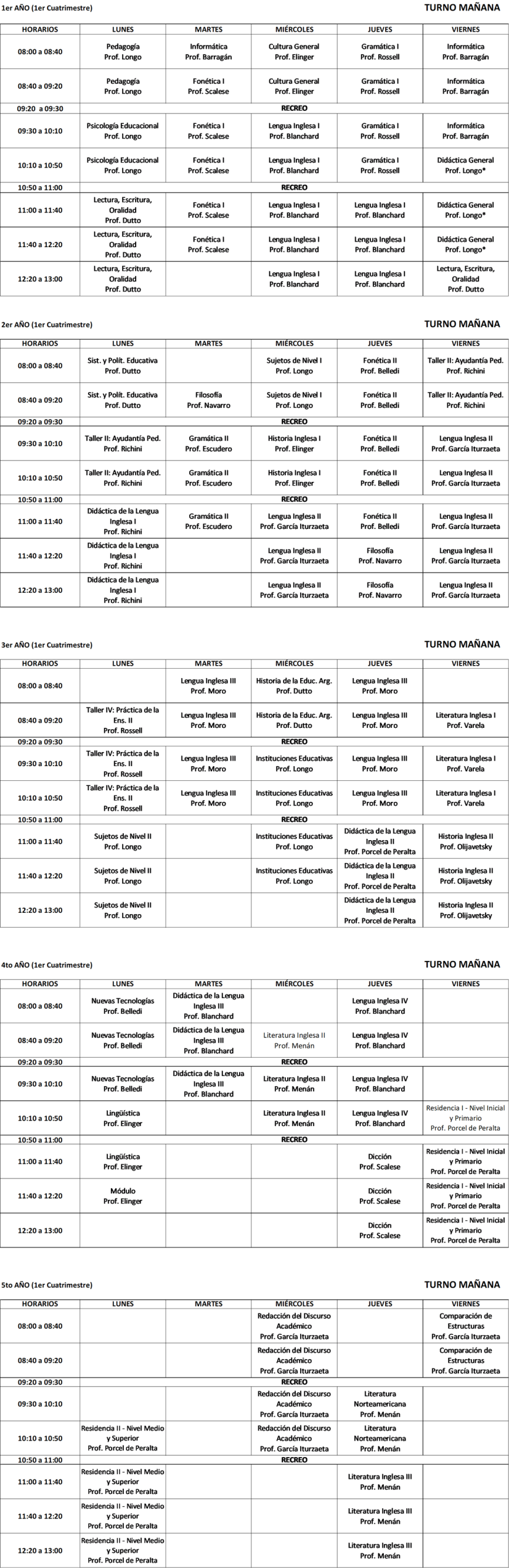 Horarios 1° cuatrimestre 2026 TM - Profesorado