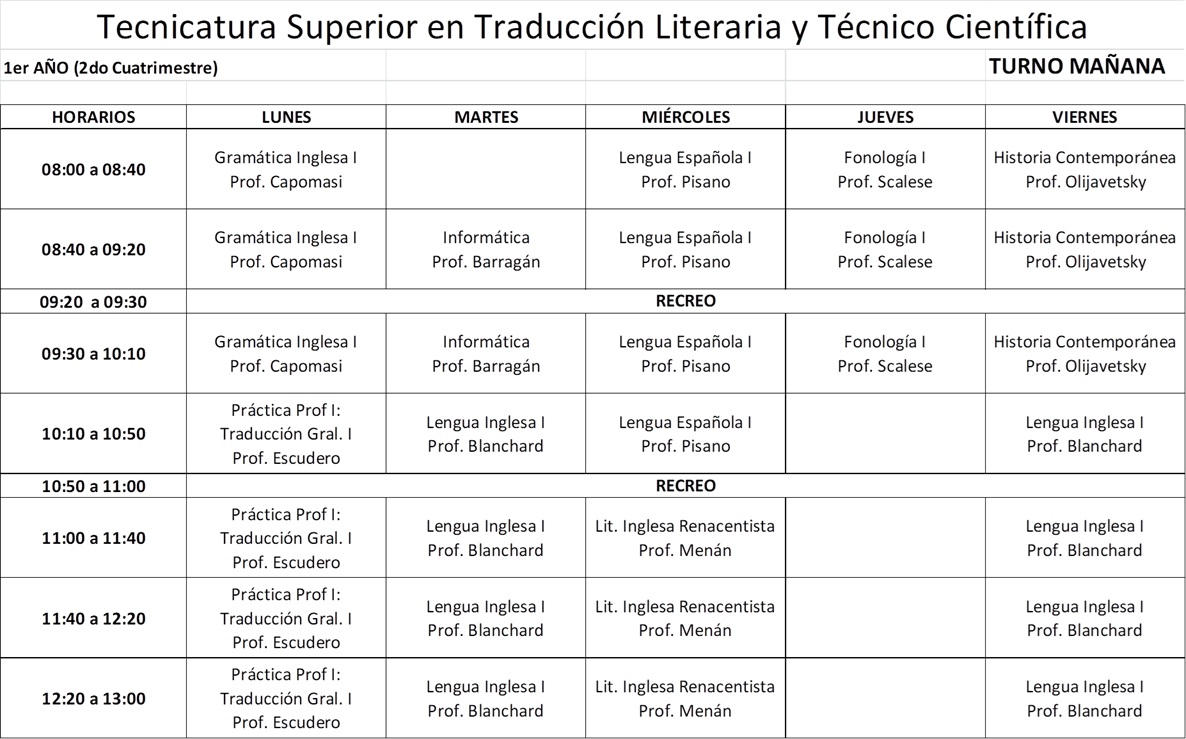 Horarios 1° cuatrimestre 2025 TN - Traductorado
